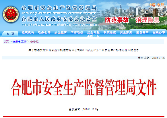 關(guān)于核準(zhǔn)安徽東強(qiáng)新型節(jié)能建材有限公司等118家企業(yè)為三級(jí)安全生產(chǎn)標(biāo)準(zhǔn)化企業(yè)的通告