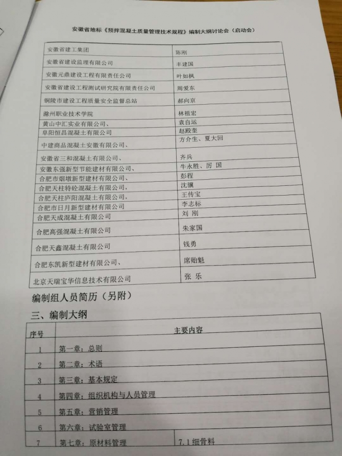 2018年6月26號安徽地方標準《預(yù)拌混凝土質(zhì)量控制技術(shù)規(guī)程》編制工作組召開編制大綱討論會(啟動會),我公司作為參編單位,由公司技術(shù)負責人牛永勝總經(jīng)理代表參與此次會議的討論。