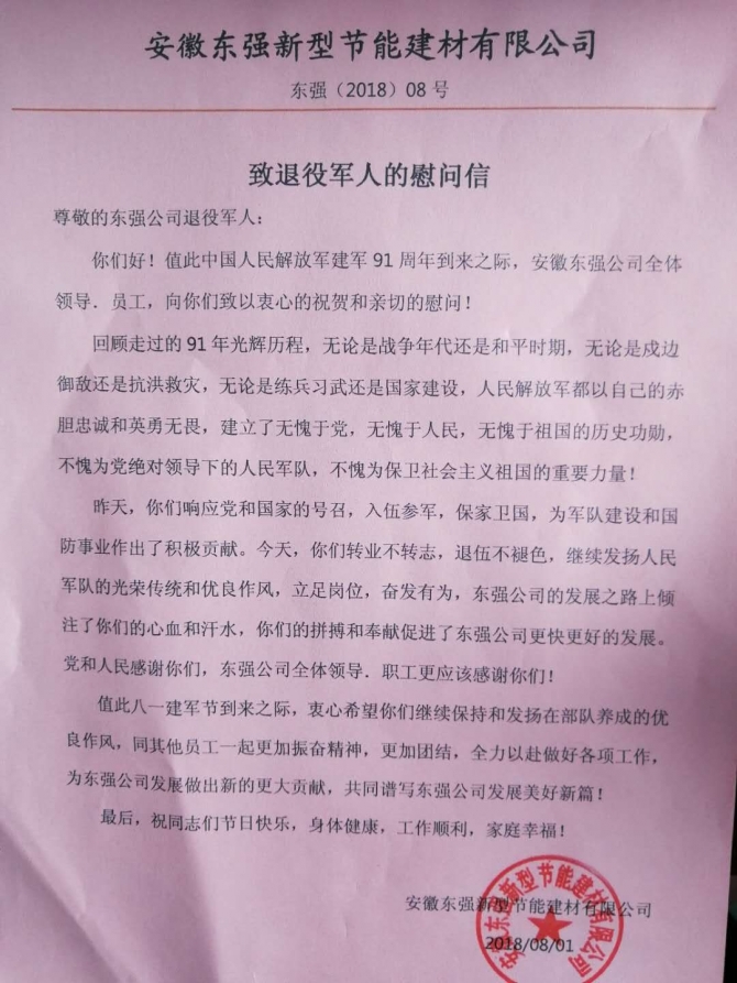 今天迎來(lái)中國(guó)人民解放軍建軍91周年,安徽東強(qiáng)公司全體領(lǐng)導(dǎo)、員工,向祖國(guó)最親愛的子弟兵致以衷心的祝福,同時(shí)向公司退伍軍人表達(dá)親切的慰問。